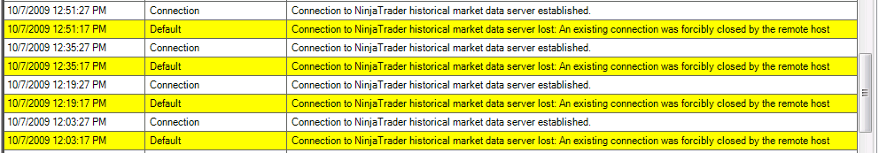 NT7 points to a new and improved Historical Data server. This is a known issue and has been fixed. We will update the server over the weekend and this issue will be gone next week.Originally posted by RichardTodd View PostI've noticed lots of these zen-fire "lost historical connection" messages in my Log tab, though I haven't yet noticed any ill effects from it. This doesn't happen to me on NT6.5 as far as I can tell. It happens to me both during the day session, and overnight. Not sure if it's a problem or just new behavior.RayNinjaTrader Customer Service
