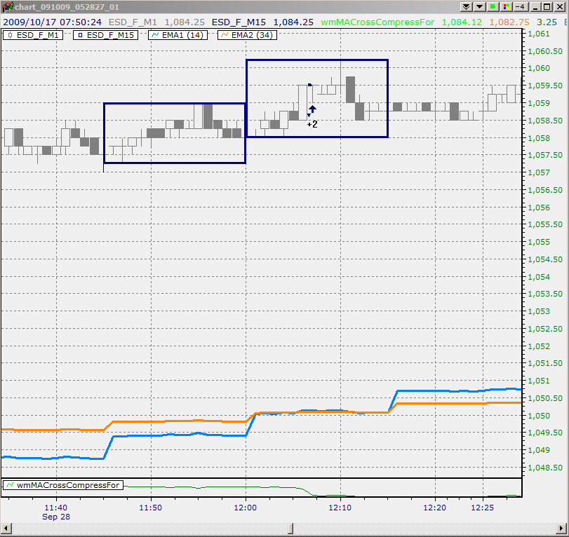 I would like to advance the idea of a CompressSeries that would compress the OHLC values from a lower timeseries into a higher timeseries and allow intrabar snapshots of the higher timeframe (or indicator thereof) to be made available to the lower timeframe. For example,