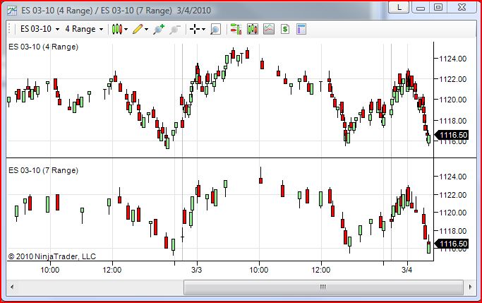 You can't just say I want to paint the 4 range bar at 9:30 and also the 7 range bar at 9:30 because that will make it look even. The 4 range bar closes at 9:30 and the 7 range bar may close at 9:33. You have to plot them when they close. It does not make any sense otherwise.Josh P.NinjaTrader Customer Service