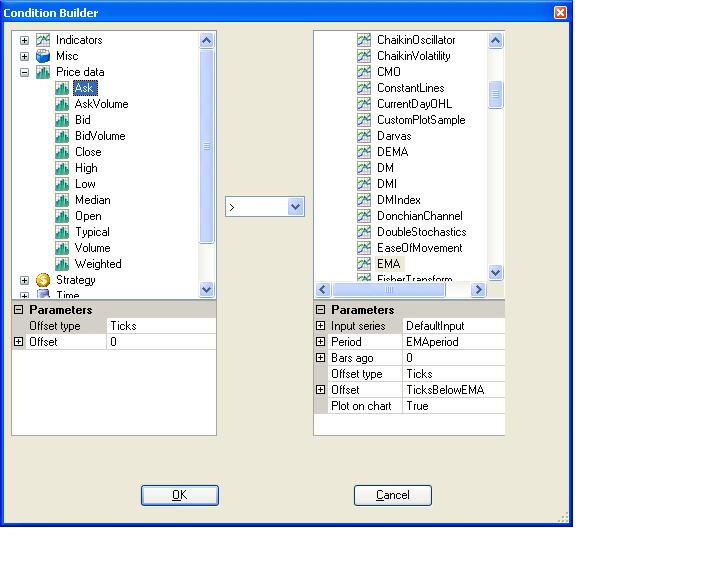 My Wizard-created strategy uses 2 EMAs with the same period. One of them has Offset=0, the other is Offset = -2. Both are set to Plot on Chart=True. However, when I look at the chart in Strategy Analyzer after running the backtest, I only see a single plot. I think both EMAs are plotting one on top of the other instead of offset, since if I change the period for one of them, two lines result.