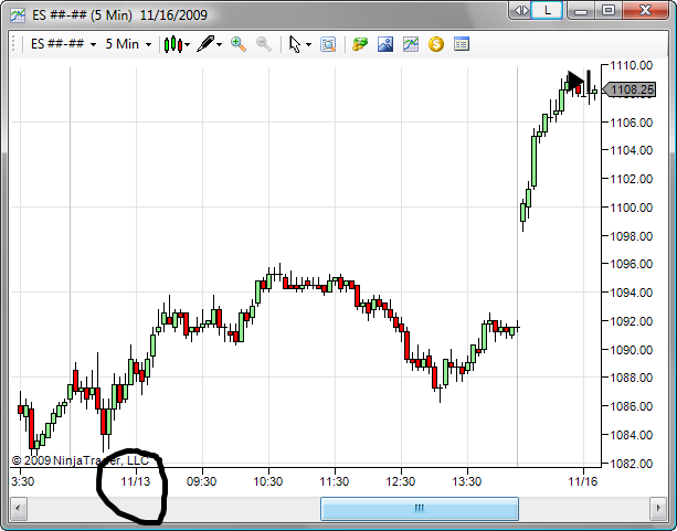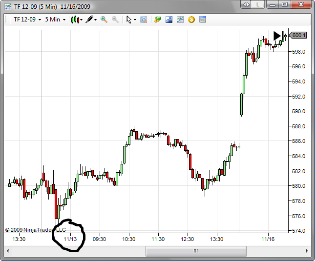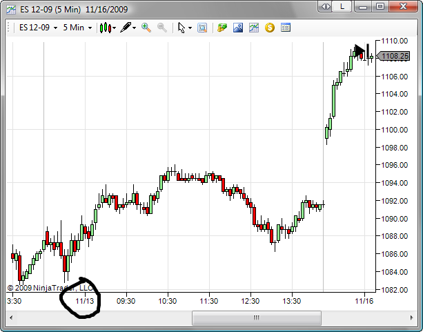 Agreed - that's what I was planning on doing. Will be in touch tomorrow. Thanks for considering this issue.Originally posted by NinjaTrader_Josh View PostBased on the new information you have provided the scenario now is much different and clearer. Tomorrow, please confirm that you are then missing the 11/17 day with 11/13 and 11/16 present. That will confirm you are running into an issue with missing of the previous session's data.