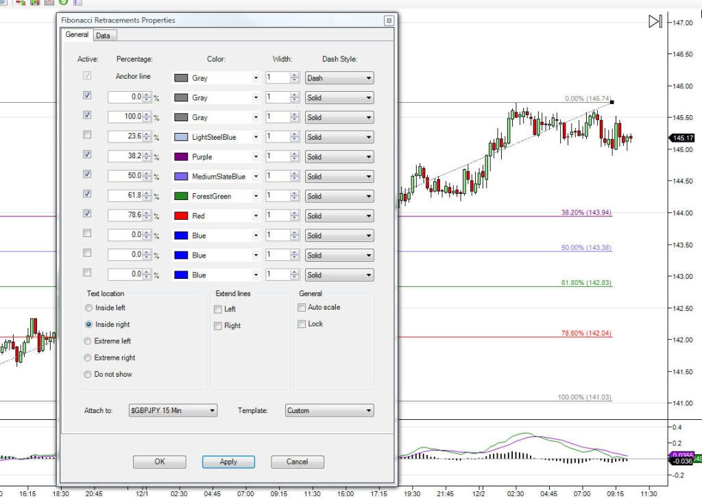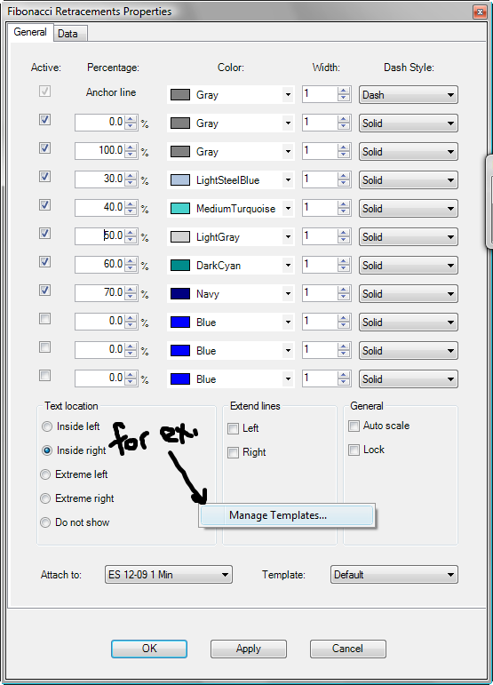 1) all parameters (colors, alignment & calc %) for fib ext, ret & time should be settable as a default