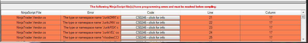 My indicator does not refer to the namespaces mentioned in the error report. Double clicking on an error line opens NinjaTrader.Vendor.cs.