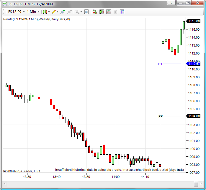 This is the test. Started NT 7.0.0.6, connected and opened a single data series chart for ES 03-10 (15 min, lookback 65 days, all default). Then I added a daily, weekly and monthly Pivot indicator with default setting DailyBars. These are my findings:
