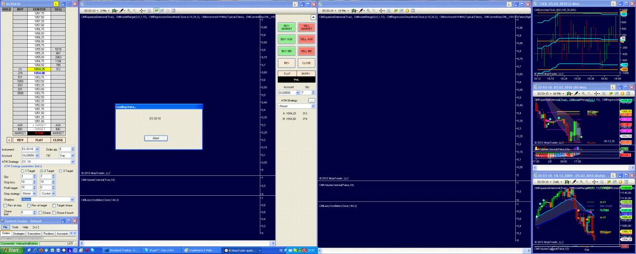(b) Unlike the old problem, which was solved, this time the status bar of the control center shows no data loading. Everything is working correctly in the background with charts being displayed, prices and indicators moving. Just the indicator dialog box does not go away and locks the access to NinjaTrader.
