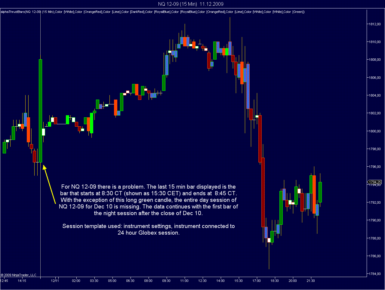 Sometimes, when opening a chart, data from the session is missing, as shown below: the 15 min chart for NQ 12-09 displays no data from 8:45 CT to 15:15 CT. When switching time intervals to 5 min and then back to 15 min, the data is correctly displayed. At the same time NQ 03-10 was displayed correctly. This chart uses the same instrument settings and template.