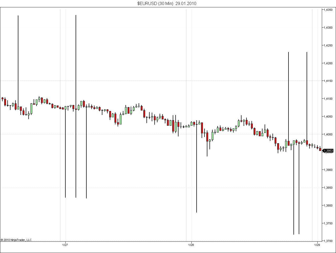 Spikes appear, when -> Tools -> Options -> Data -> Quote currencies (FX) in is set to < Pip >. When reinstalling NT 7 this afternoon, I had forgotten to adjust the settings. For IB I have to set this to <HalfPip> or <TenthPip>, both works .....