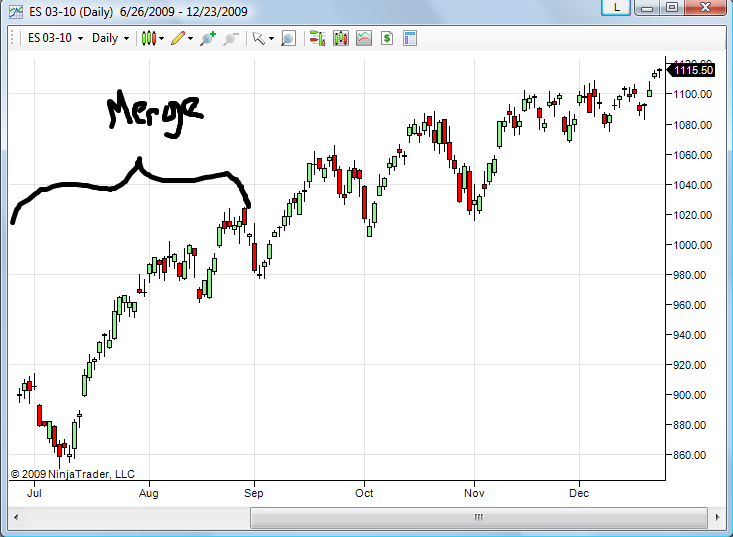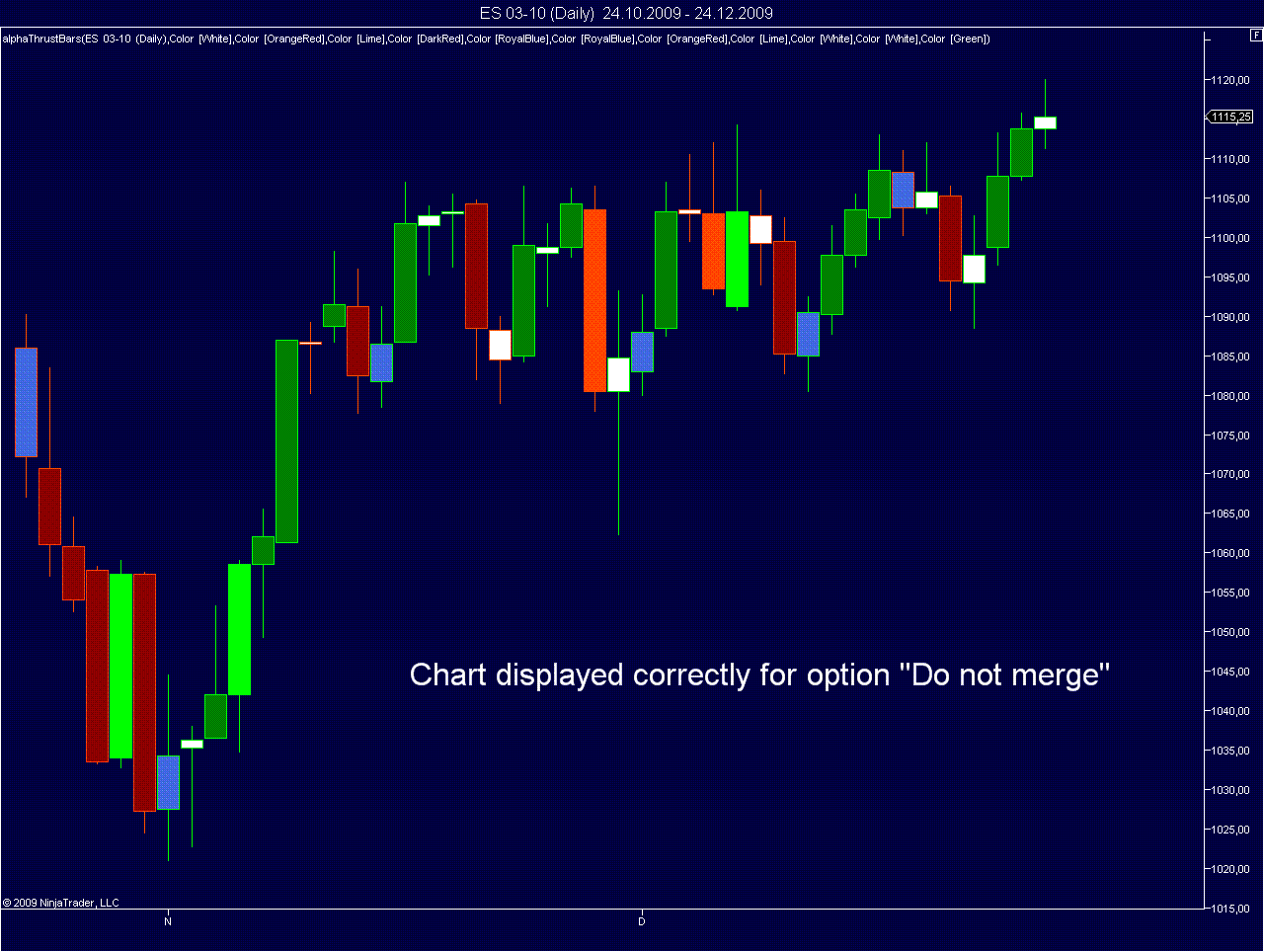 After the merging procedure by NT 7 the bars (same shape) are displayed with the correct date but false values (see the 2 charts of my first post). It seems that NT 7 has a problem with the handling of dates and therefore creates a merged contract with false data.