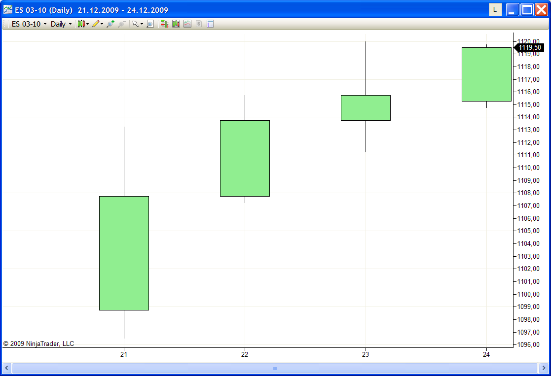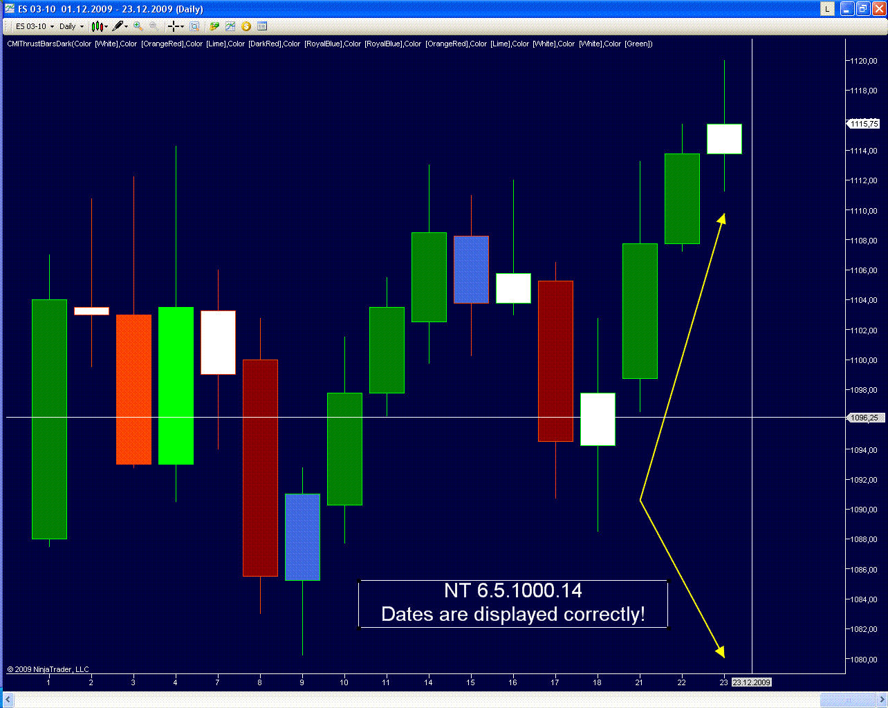 I just started checking the UNMERGED daily charts ES, and this came to my attention: While NT 6.5. displays daily data of Interactive Brokers correctly, NT 7 displays them with a date one day ahead (x-axis date, but not cursor date). The difference can be seen in the charts below.