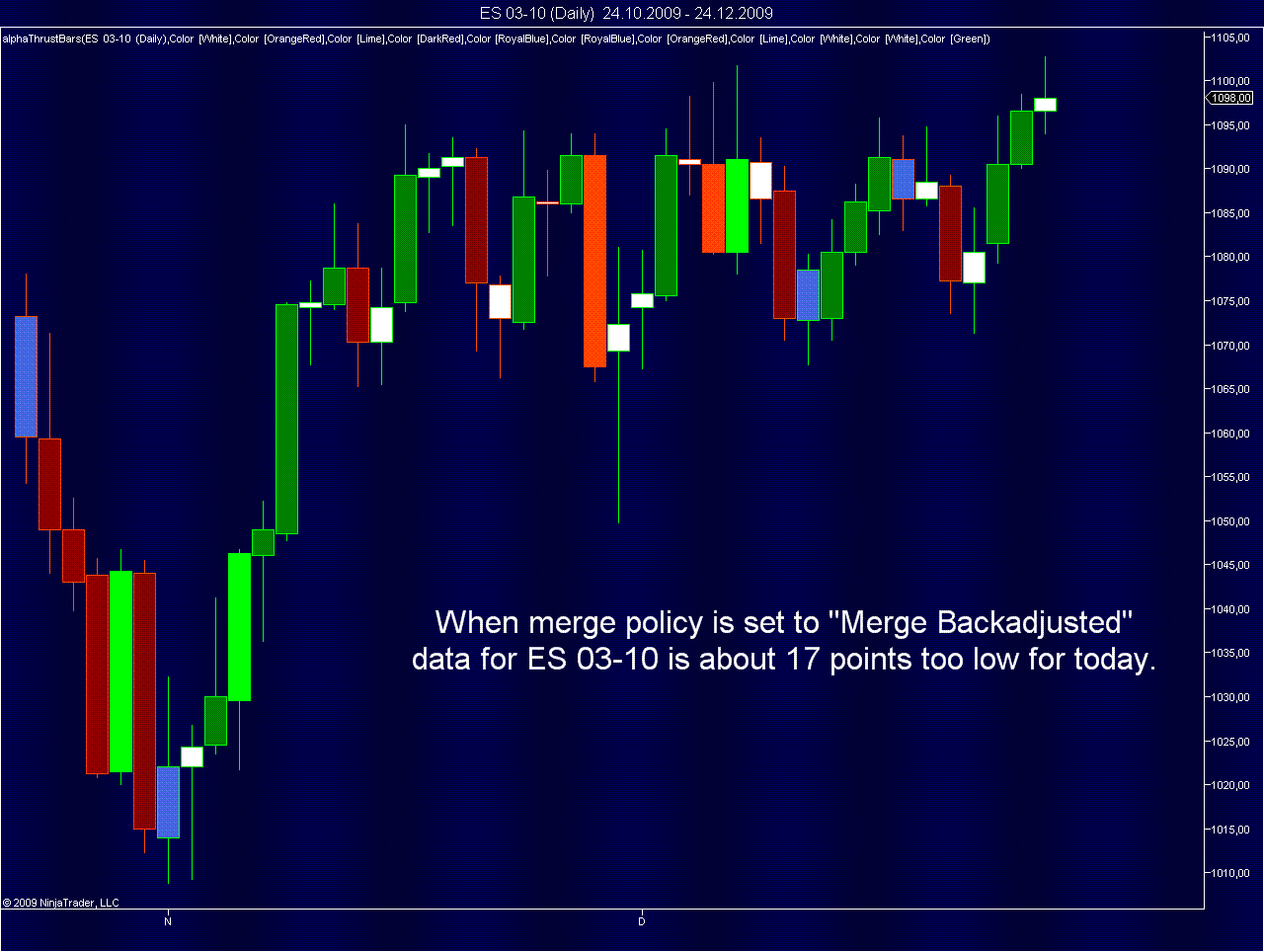 (2) For NT 7 I get completely false daily data. Usually the offset should only be applied to the backadjusted contract (ES 12-09). The problem is that the daily data after the rollover date is completely false as well. Tell me: How can the offset affect the data after the rollover date?
