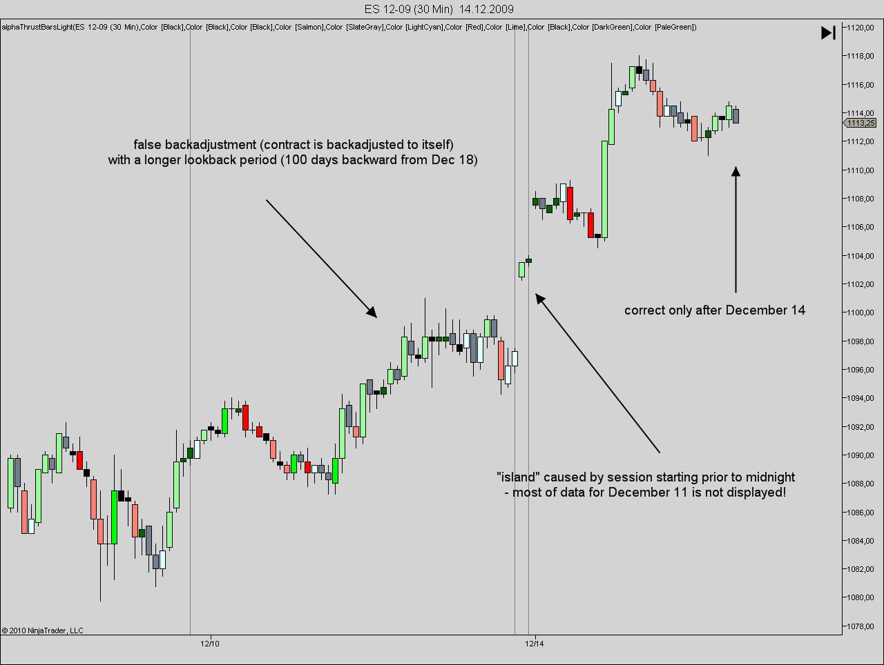 Chart for ES 12-09 with a lookback period of 15 days (last day of chart period Decembre 18): No backadjustment prior to Dec 11 (correct), data missing on rollover day, correct afterwards.