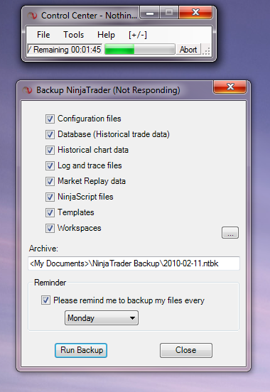 How long should this backup take? I'm getting '(Not Responding)' in the title bar of Backup NinjaTrader window with time remaining stuck at 00:01:45. I gave it 6 minutes and then had to use task manager to shutdown NT.