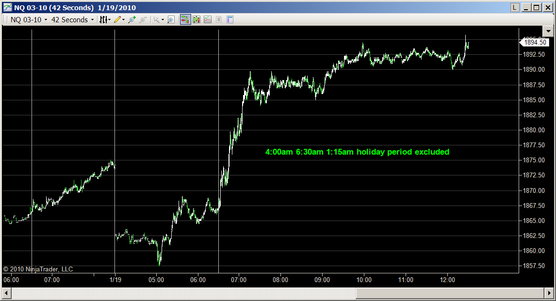 Josh...so with historical data you cannot count the empty bars between bars that have data in them ??...don't you have a fixed incremental time scale for the loaded data running across that data that shows bars and empty bars in a graphic horizontal scale on equidistant false charts...just curious how this works...thanks...Last edited by Alfred; 01-19-2010, 07:55 PM.