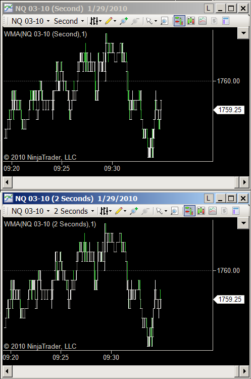 Here is another problem you can run into with the way horizontal chart scaling is set up now...below are 2 identically sized charts...one a 1 second chart..and below it a 2 second chart...they are both set to max compression, yet they look identical...this can sometimes happen perhaps after you let charts run awhile and re-size one of them I believe. You often just do not really know what you are looking at in terms of chart compression....screen shot below...