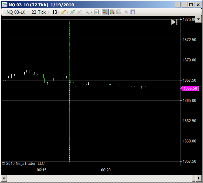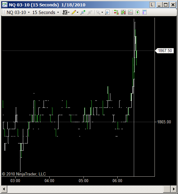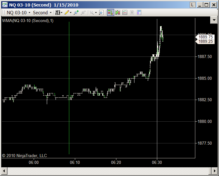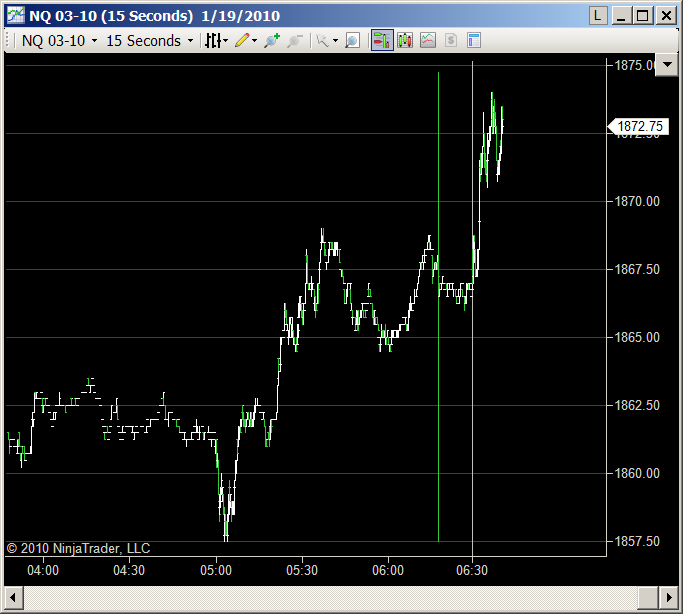 Odd green line reproduced this morning when checked for 15 minutes after open. Created a new seconds chart with instrument settings, equidistant false...green line showed up to left of open. (left screen shot below) Changing the seconds chart to a tick chart the green line changes to the vertical line with tick marks. (right screen shot below)