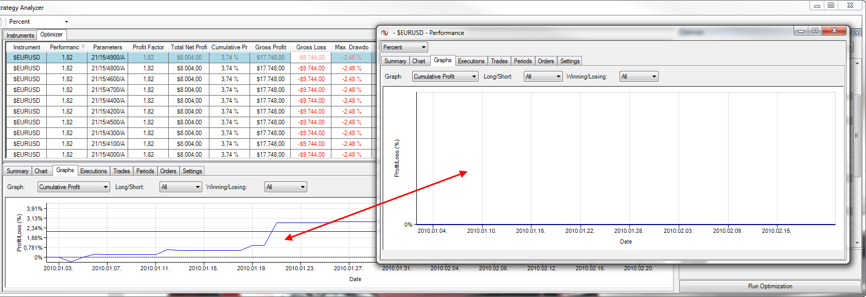 if you right you right click --> performance viewer on the line of result of optimizer, there will be data on Summary TAB, the others are empty.