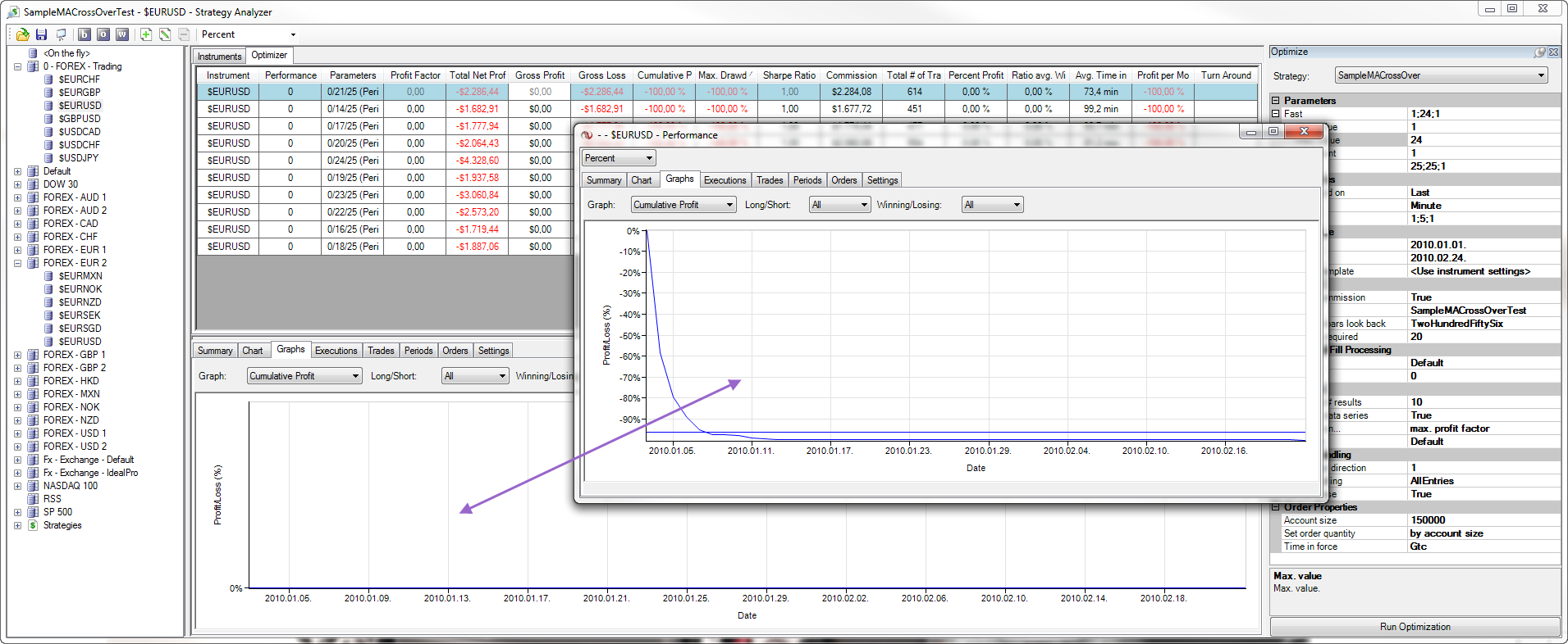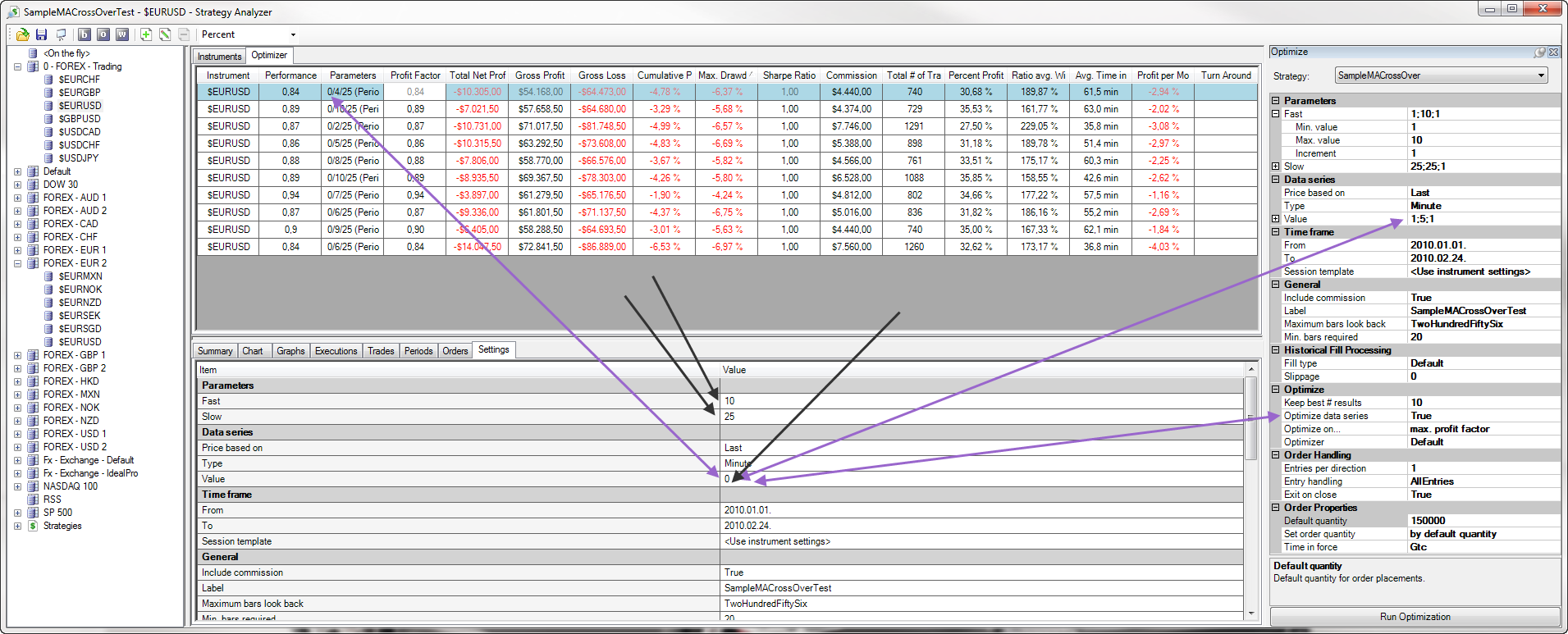 - Run Optimizer on SampleMACrossOver strategy. (Important: allow "Optimize data series" and set something to have sense.)