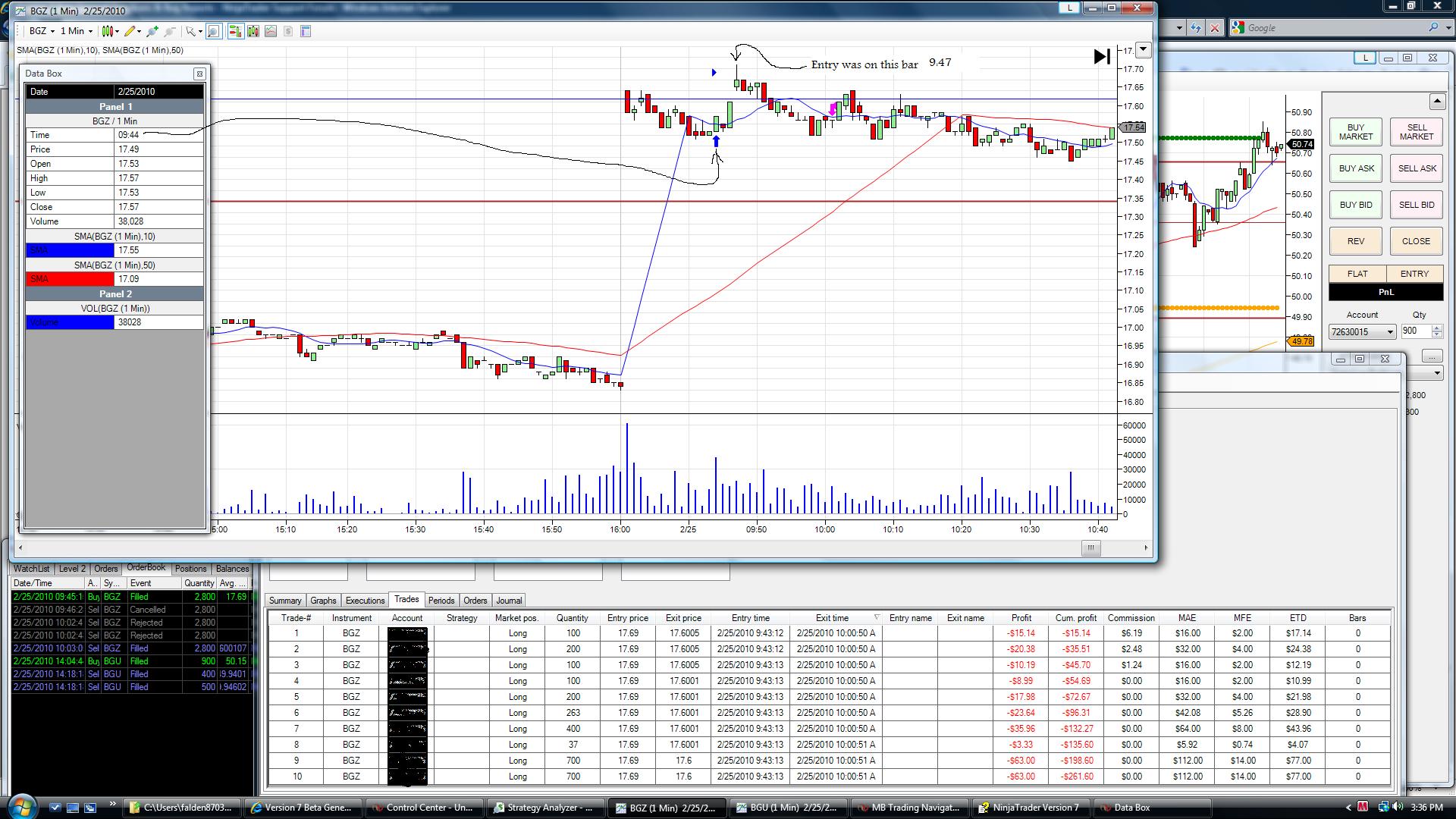 See attached picture. You can see by the execution price that the trade could only have occured at 9:47. Also, by memory, I know the trade occured on the highest bar.