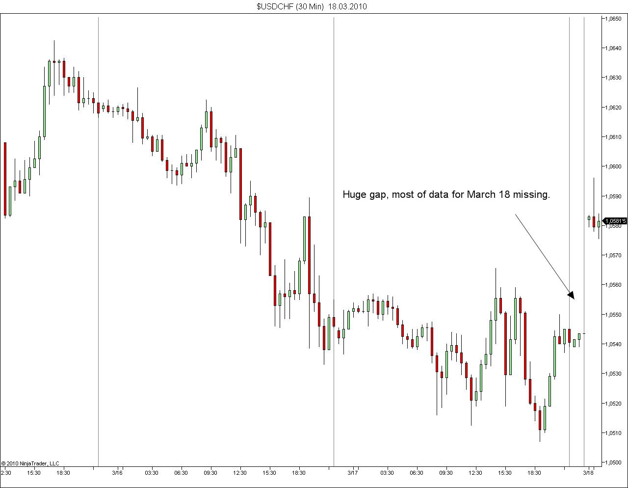 Unfortunately like the Volume spike thread, we cannot reproduce. Please provide more information. At this point in time all I can suggest is for you to start with a 100% blank database and zero cache. Then, write down exactly what times you connect to your data provider, exactly what time you open your chart, exactly what time you close the chart, exactly what time you close your data provider connections. All information is absolutely necessary as to when it leads up to the point where you don't get 3/18 loaded. Periods of time when you are not connect will be critical information to note. Periods of time when you don't have the instrument running is critical to note as well. All information as to when you load data is needed as well. Thank you.