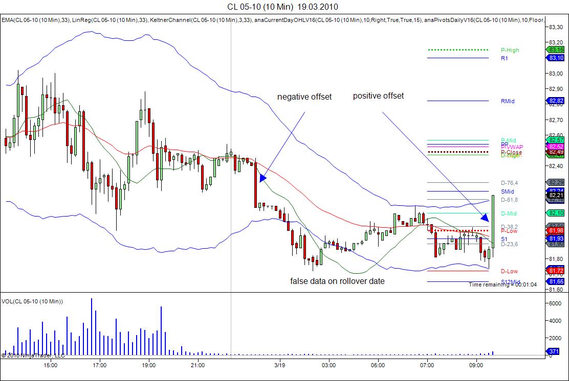 I just want to point out that Mike 12345 has reported the identical problem for CL 05-10 on rollover day and shown it on a screencast. So you can actually see how the price jumps up when real-time data follows historical data. It is #1 of the following thread: