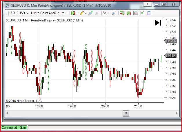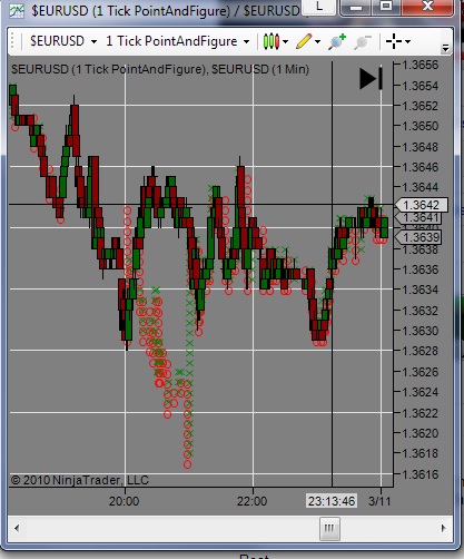 the first is a point and figure chart of a 1 tick increment with a 2 tick reversal and on top of that is a 1 min candlestick.
