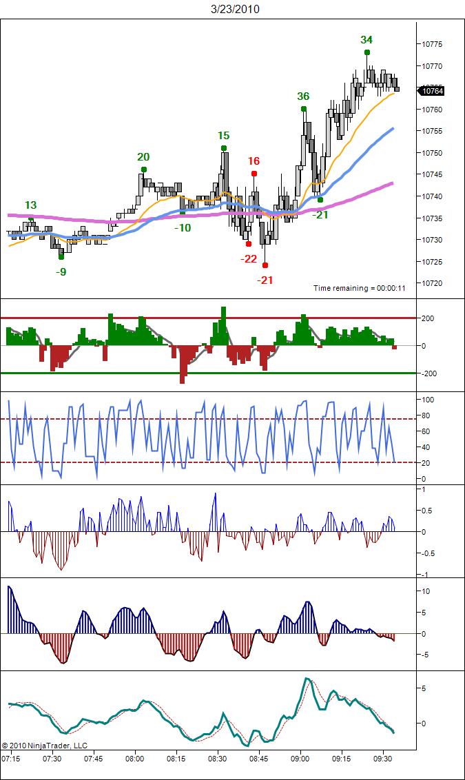 I have a 1 minute, 5 day chart with a 5 minute 5 days back chart both plotted in panel 1. The 5 day is set to Transparent. I add various indicators and all works well.