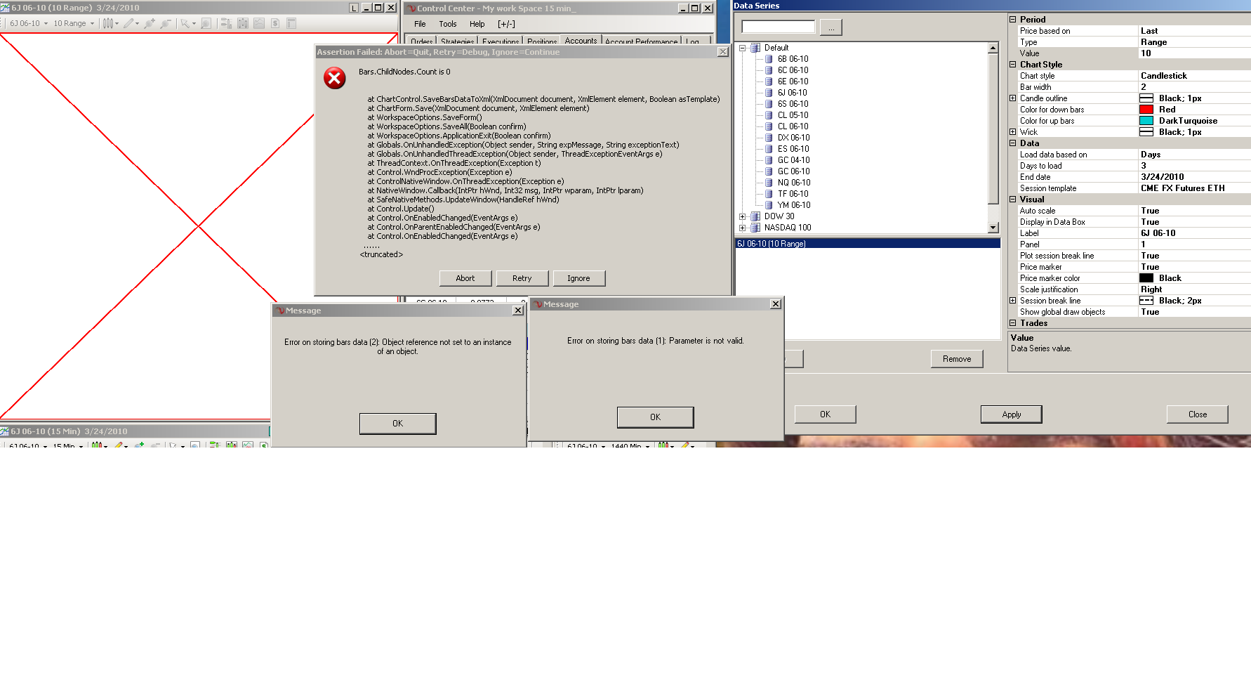 Just I have this problem when you change data series from time to line break or change the parameter of Line break two or three time NT is locked and have to start it.