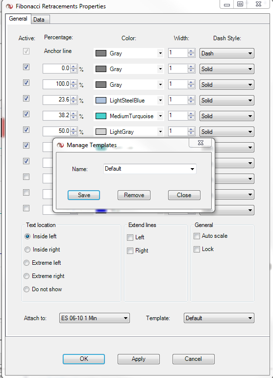 Sorry, but i cant seem to find Manage Template option, or it does not work the way it supposed to. There is the option Template and it is set to default. But when i draw another fib retracement it does not give me my fibo settings i adjusted but original Ninja settings. Could you please provide me with more guidance?