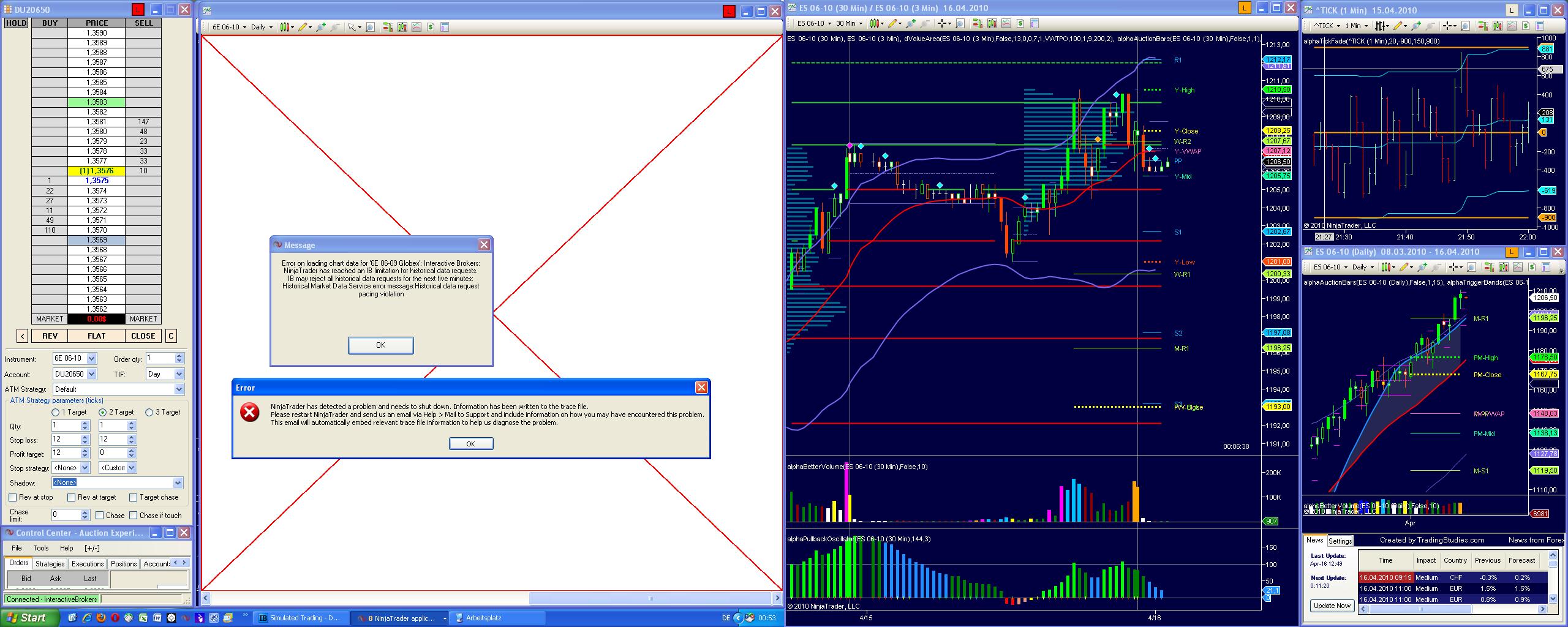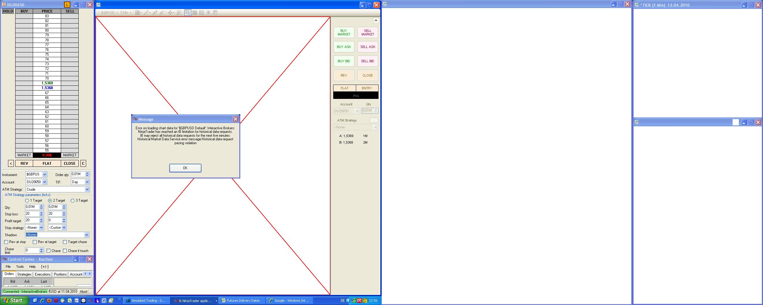 When loading backfill from IB I ran into a historical data request pacing violation. NT responded with the famous RED CROSS (screenshot below). As NT was completely locked, I had to shut it down.