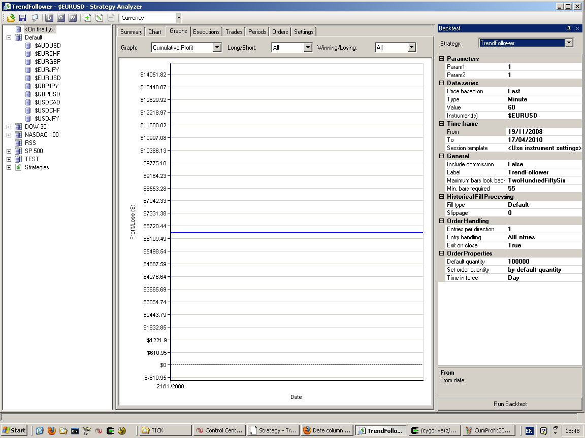 If I look at the cumulative profit in the strategy analyzer, it just shows a flat line for the multi-year period.