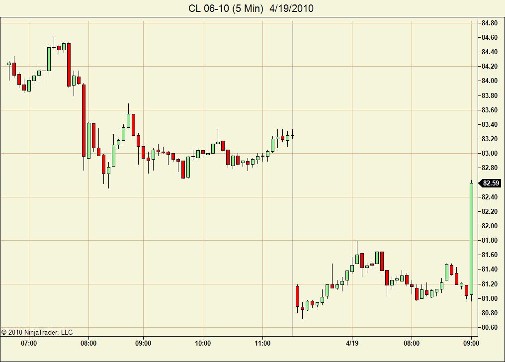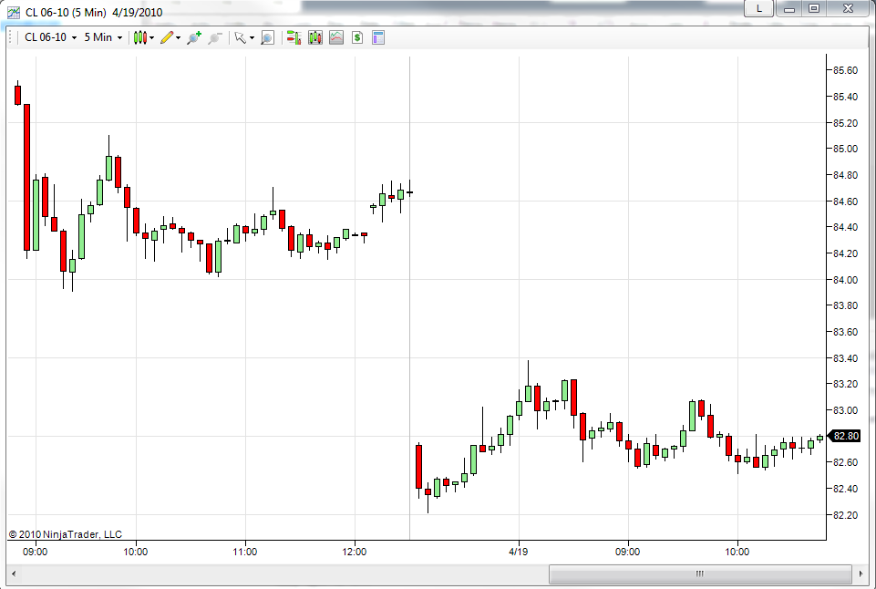 On the 20th after the rollover data you may then set your Merge Policy back to "UseGlobalSettings" and you will not recieive this spike with the previous contract data from CL 05-10 loaded as well.Christopher J.NinjaTrader Customer Service