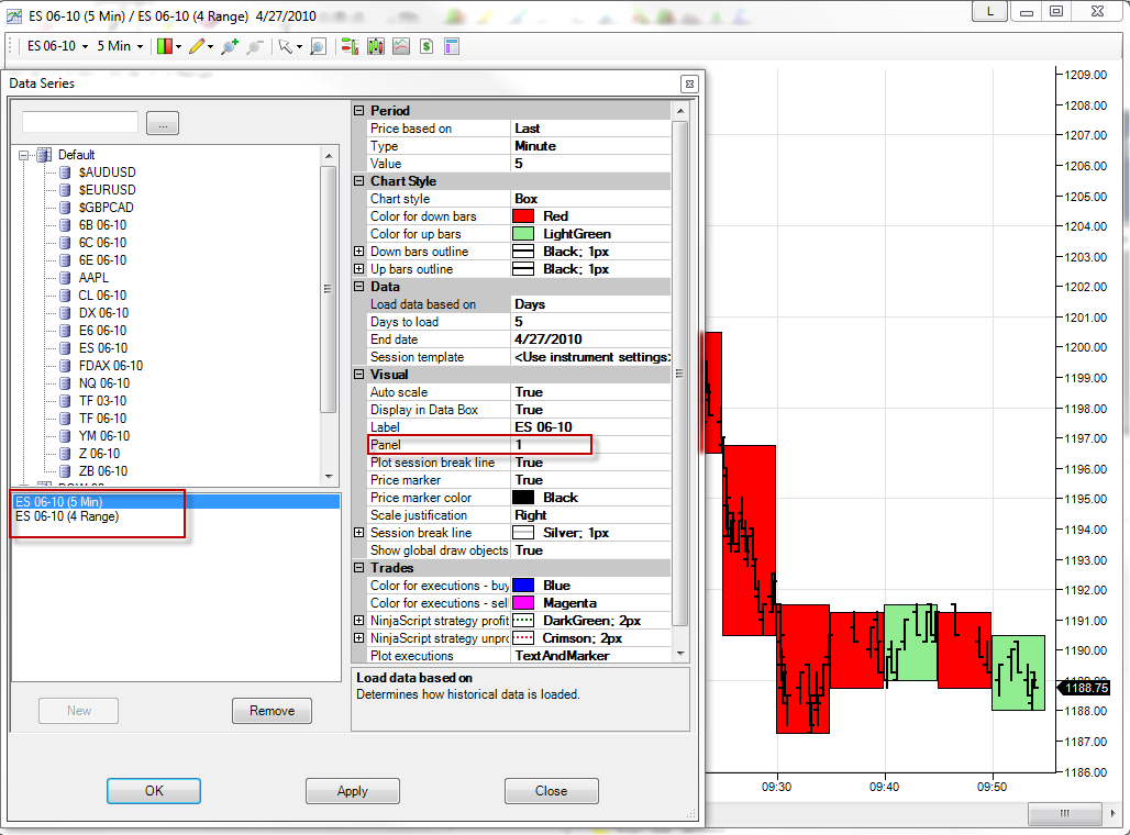 As you can see within the attached screen shot I have created a 5 Minute Box chart with a 4 Range OHLC chart overlayed.