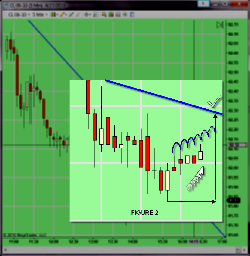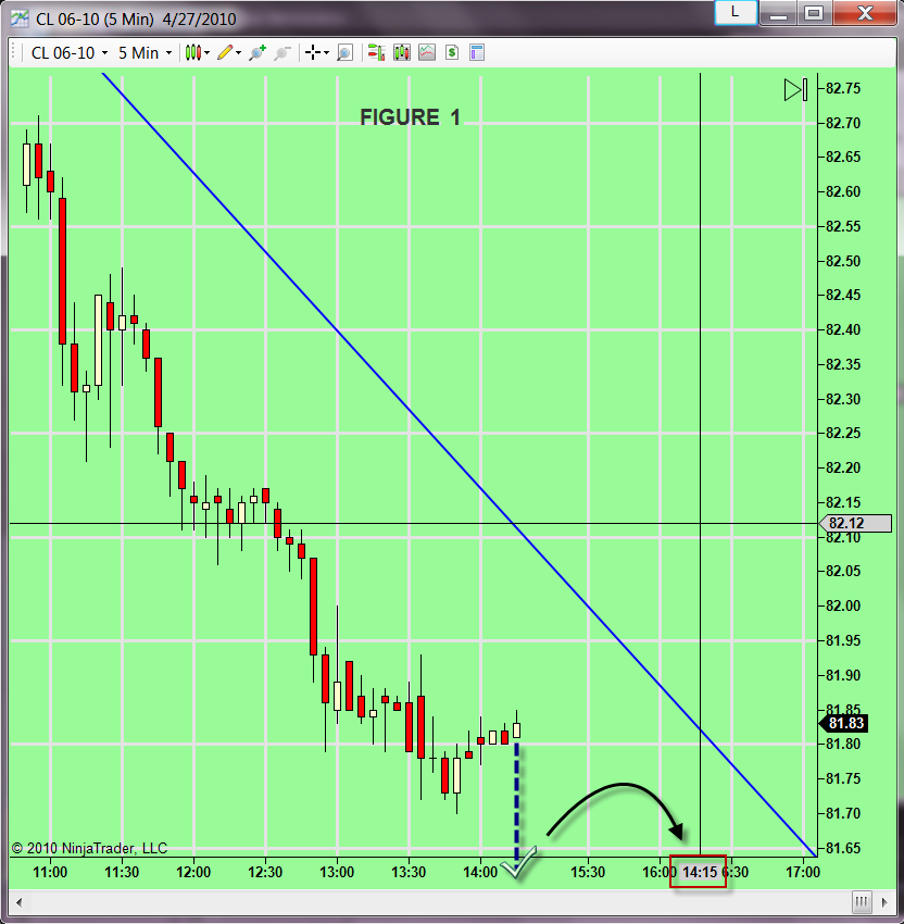 This becomes especially problematic when I'm working with trendlines. For example, assume the price target is to occur in 20 minutes at some point on the nearby trendline. Not only do I need to move out by 20 minutes in time but now I need to scroll up or down to measure at what point it would occur on that trendline (see Figure 2). Therefore, I would like to request that the cursor be locked to the price bars. This way, as I move my mouse, the cursor moves 1 bar at a time, bar-by-bar.