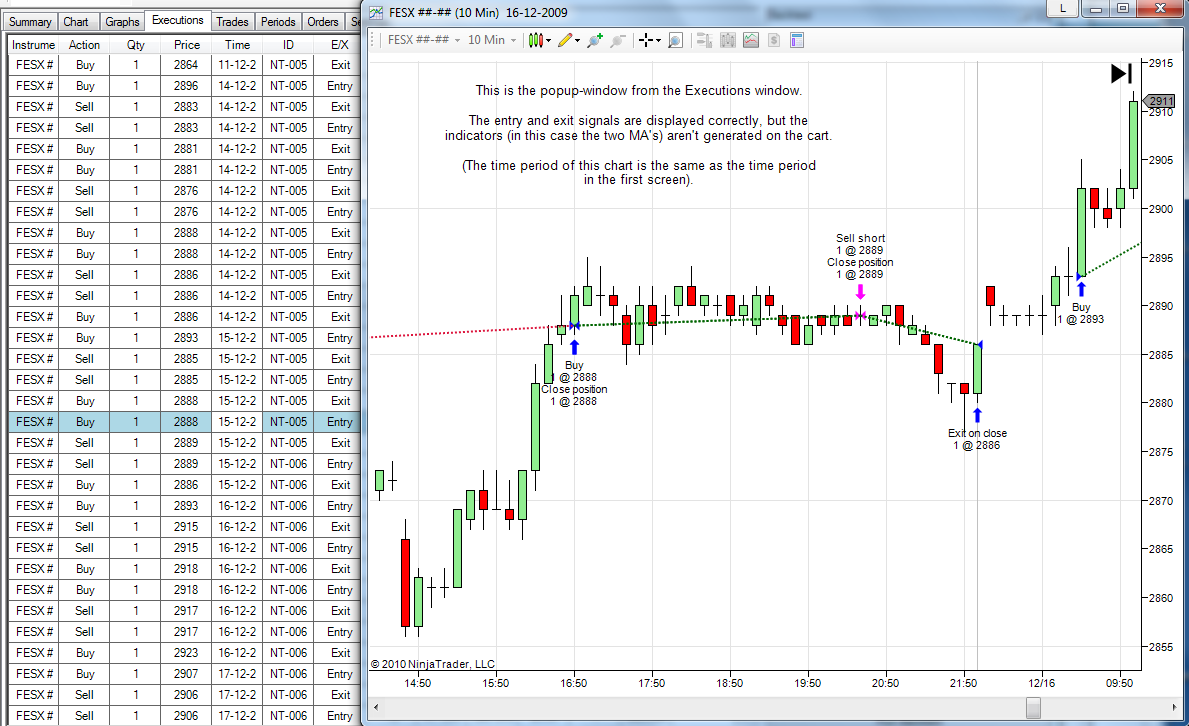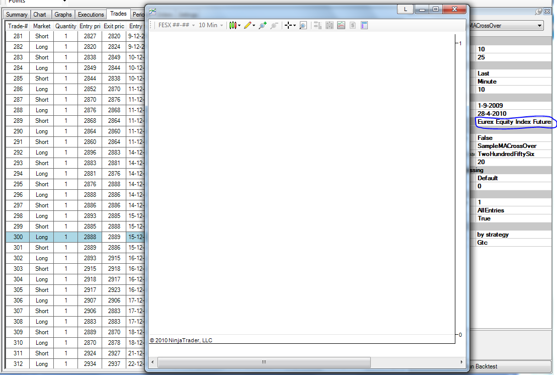 However, if I go to the "Trades" tab, and rightclick a individual trade and choose "Chart", the graph pops up, but without any arrows indicating a long or short position, and without the indicators which are added automatic by the strategy.