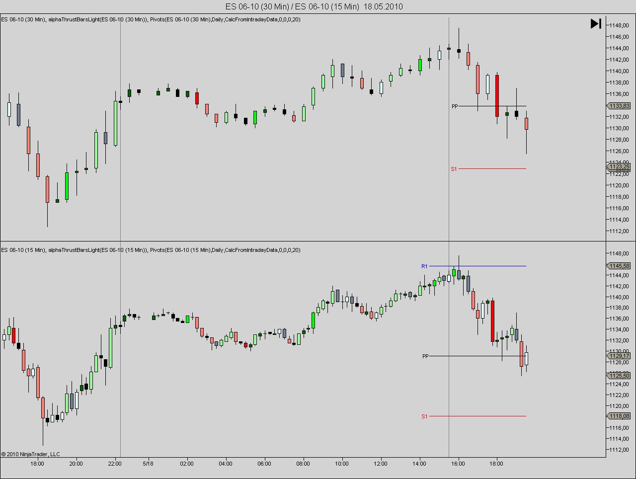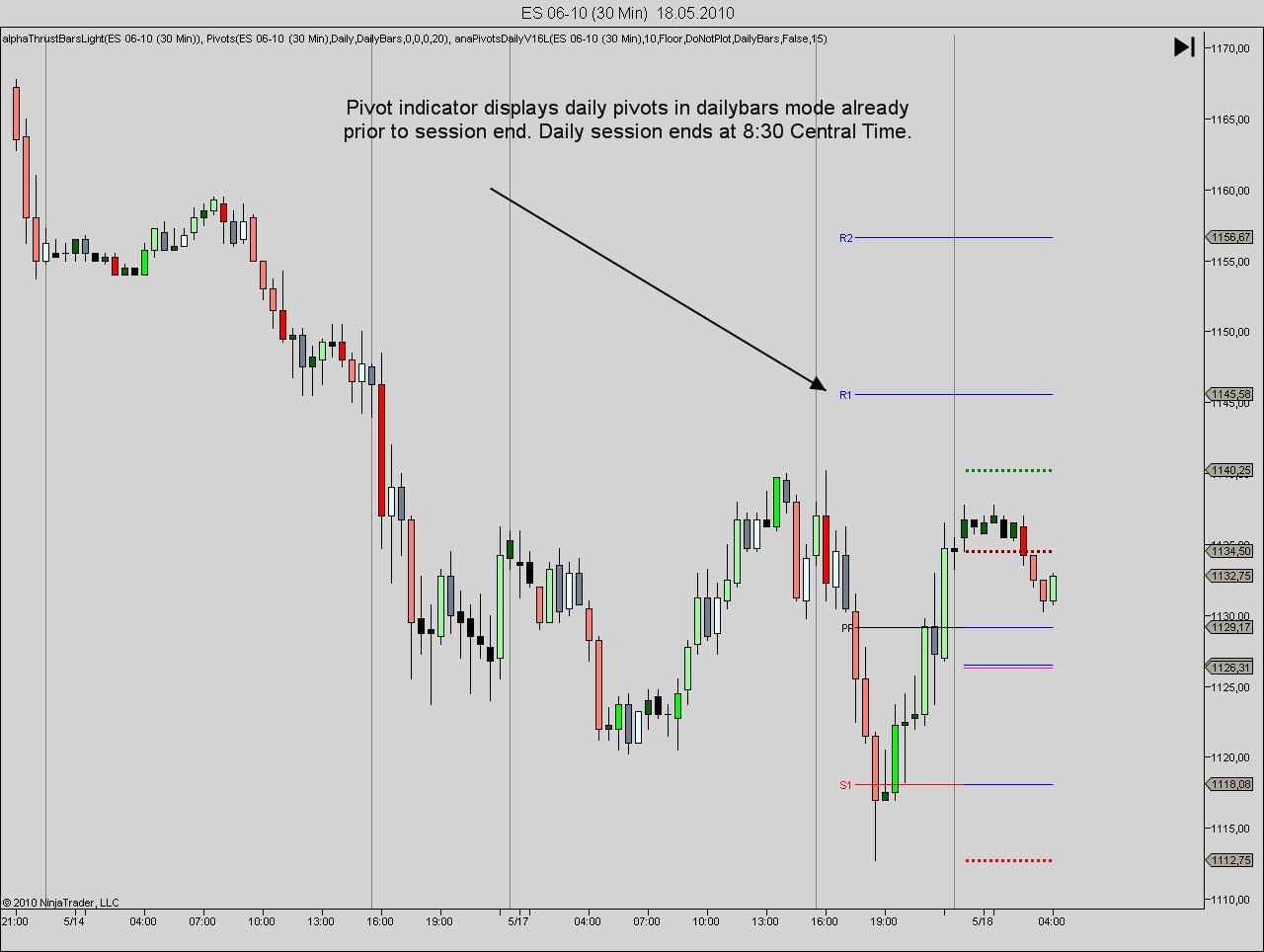 The pivots indicator should in such a case select the correct daybreak line from the various session lines of the day. The correct day break would be the session break that triggers the settlement, because the settlement (or close) price is needed to calculate the pivots. The settlement session break is usually the last of the day. So the pivots indicator should display the same pivots for ES on a double session as on a single session.