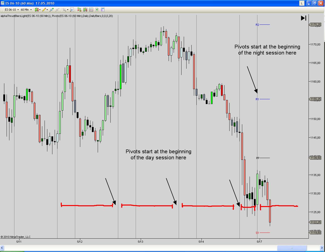 (2) The original floor pivots relate to the day session. The day session ends with the settlement, for clearing next day. The night session therefore belongs technically to the day session of the following day. Trades that you enter during the night session Tuesday/Wednesday will be cleared together with trades that you enter during the day session on Wednesday.