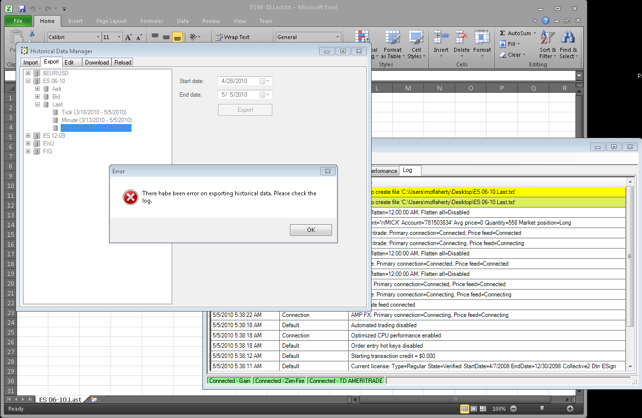 Error Text: 5/4/2010 8:37:04 PM|3|4|Unable to create file 'C:\Users\moflaherty\Desktop\ES 06-10.Last.txt'