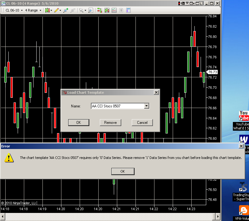 NinjaTrader 7 charts use different Data Series to show information. NinjaTrader 6.5 did not use explicit data series at all for charting, and that is why there is the 0 vs 1 data series error. It says the chart template requires 0 data series because NT6.5 did not use data series.