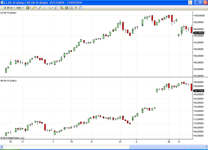 This is due to both instruments sharing the same price scale on the right hand side. Please right mouse click witin your chart-->Data Series-->Select HE in the lower left hand corner-->Scale Justification-->Set to Left-->Click Ok.
