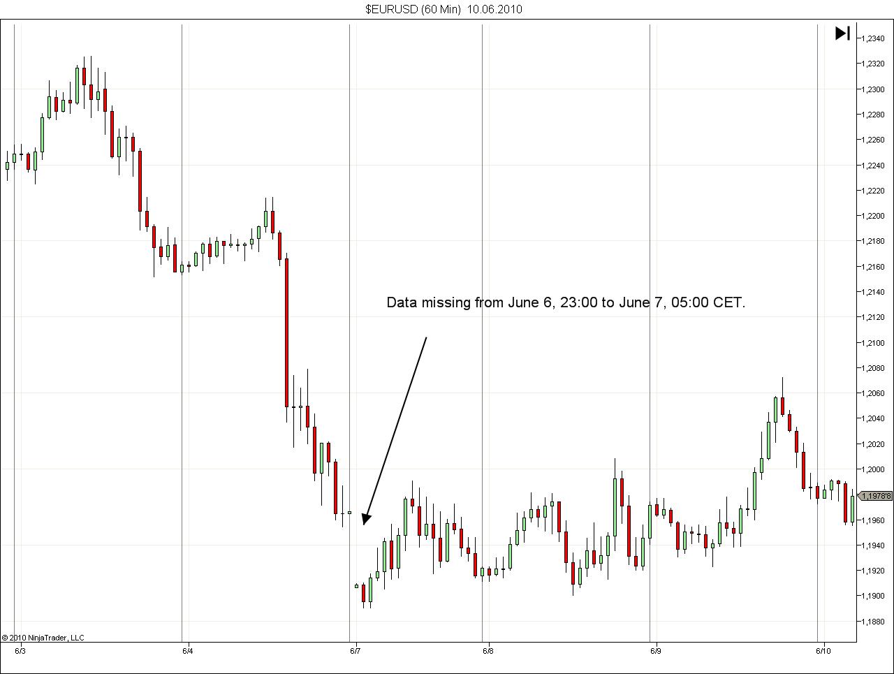 There is in fact a gap verified through Telvent (DTN) Kinetick's technology provider. The basic FX feed comes from FXCM and apparently, there are outages and when this happens, there is no way to fill the gap. They will be switching to a different FXCM feed in the upcoming future that I am told is more reliable. There is a premium FX feed that is available that is more reliable that comes from TENFORE. I am not sure if this is enable on the Kinetick beta account, you can try by editing the symbol map for EURUSD (for example) from EURUSD.FXCM --> to EURUSD.COMP. I would restart NT to force the symbol mapping change. If this is available on the account, you will pull data from this premium feed which does not have missing data for the period you specified.RayNinjaTrader Customer Service