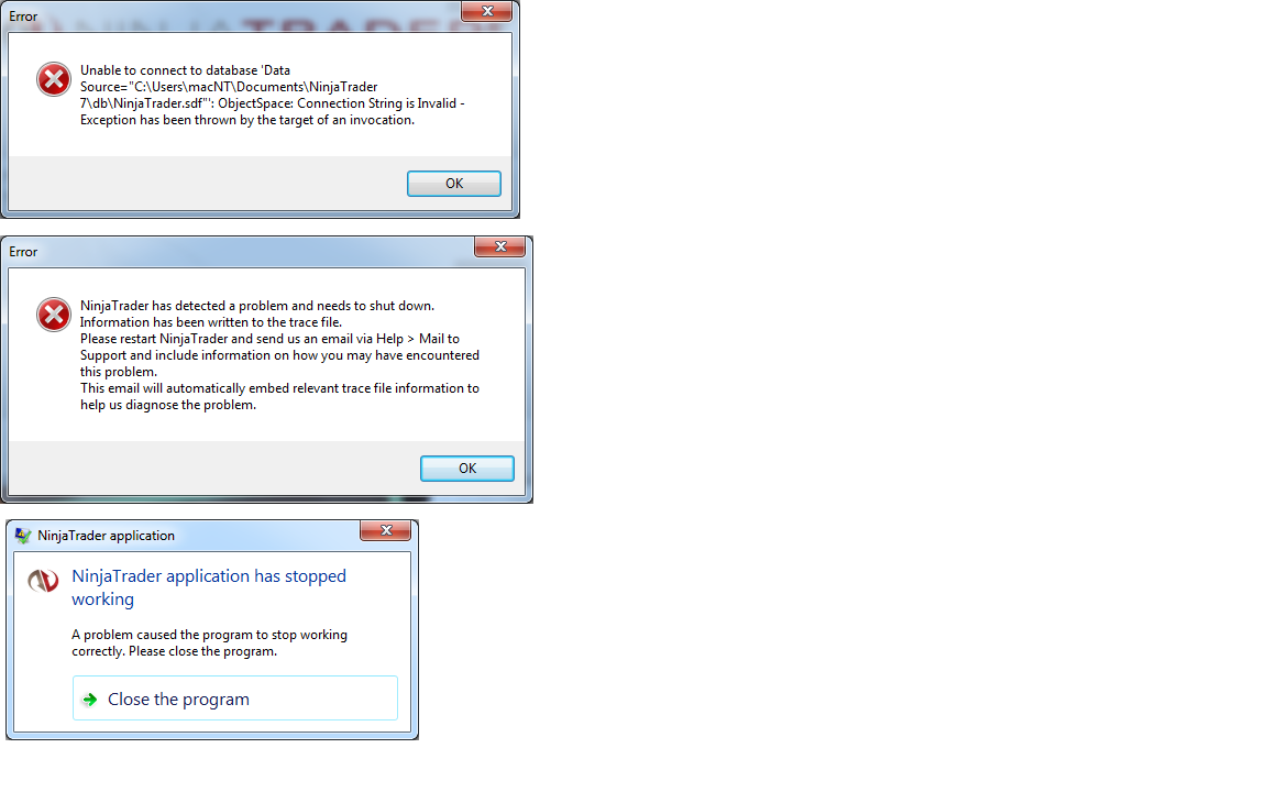 The error screenshot you posted suggests you may have some SQL CE installed on your machine. Can you please try the steps Dierk mentioned here to see if it helps? http://www.ninjatrader.com/support/f...12&postcount=3Josh P.NinjaTrader Customer Service