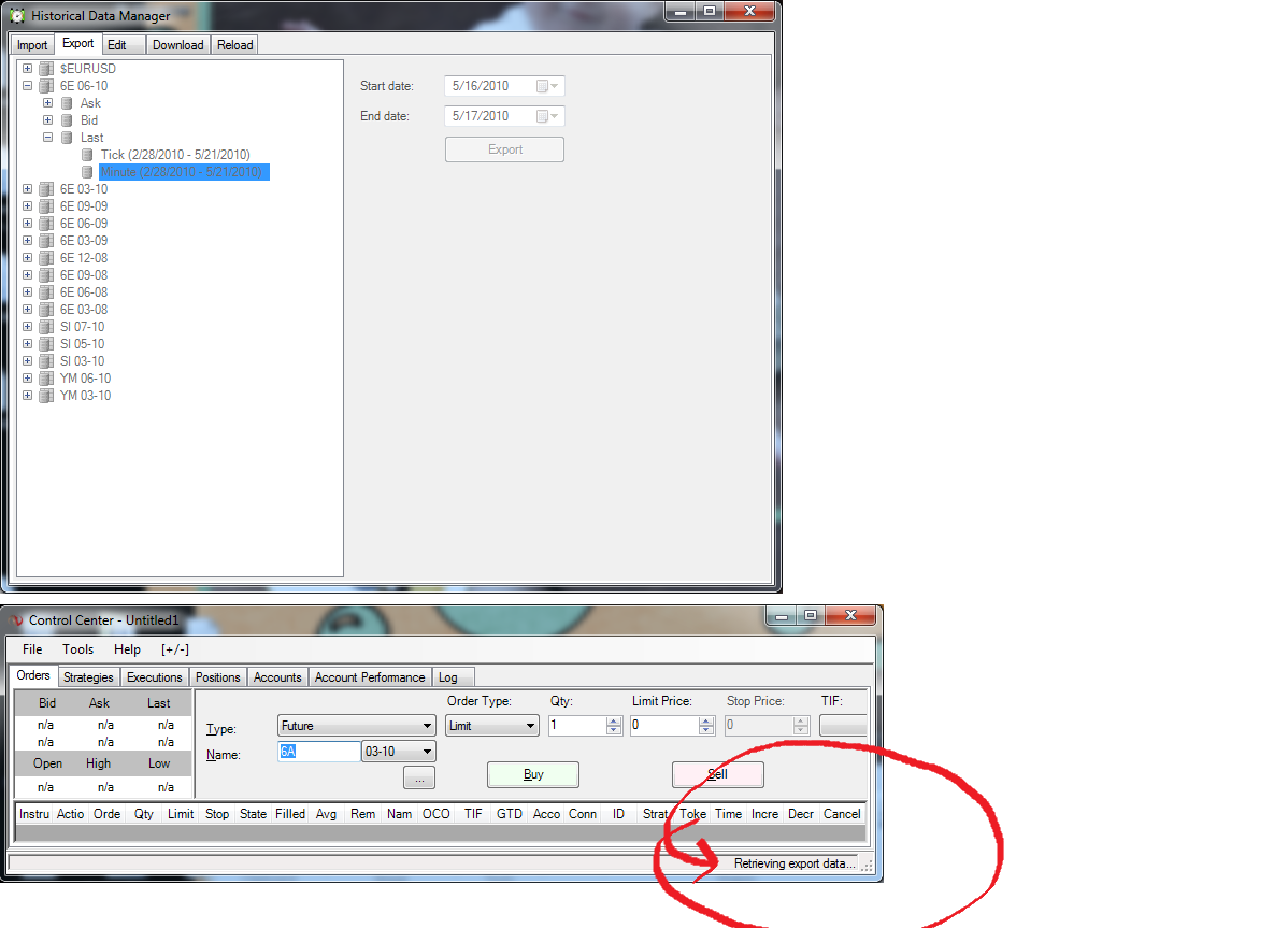 However, the Historical Data export still doesn't work for me for whatever reason. There's no error and it doesn't crash NT, it just doesn't do anything other than display the message in control center that it's "retrieving export data".