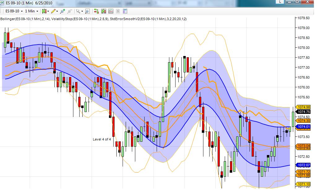 The basic chart is an 8 Range chart of NQ 06-10. The indicators are StdErrorSmoothV2 (plots are Lower, Lower2, Middle, Upper and Upper2); VolatilityStop (plots are Lower and Upper); and Bollinger (plots are "Lower band", "Middle band" and "Upper band"). Plot names in each case come from the Plots section of the Indicators window.