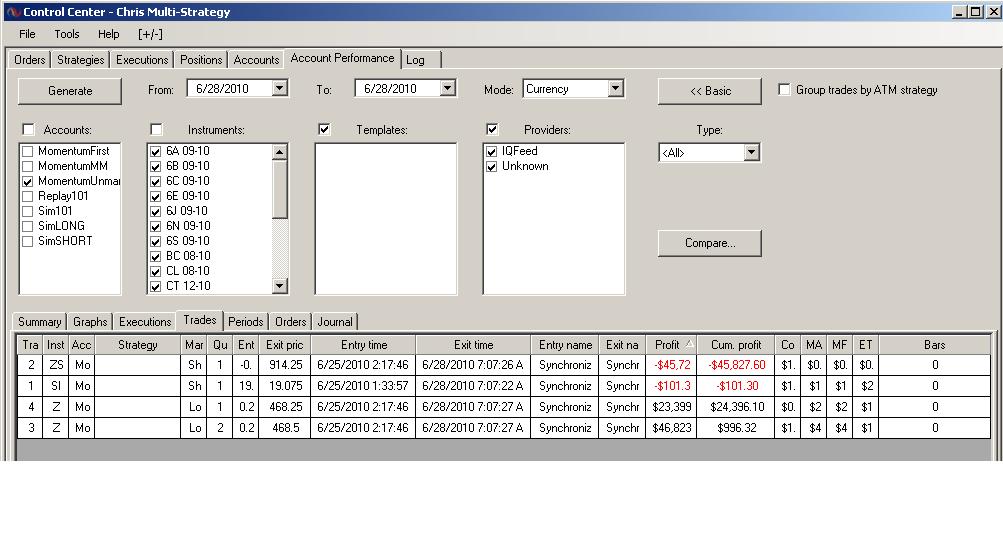Attached is a screenshot of what I got when I turned NT7 on this morning. Still in testing; I had a residual Wheat and Soybean position from friday's close (not sure how NT allowed me to sync "in" to a position where the instrument was closed but that's a different matter).