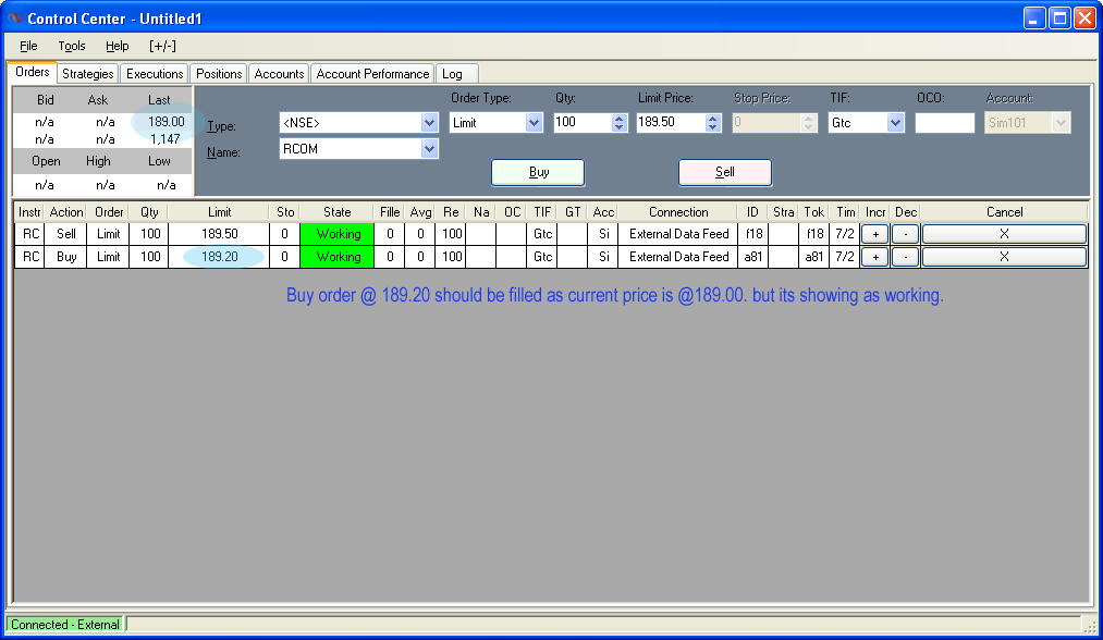 thanks for the response. as i said i am using a custom data feed and connecting it via the External Data Feed (File > Connect > External Data Feed) and not using any broker like IB or so. I am just trading SIM101.