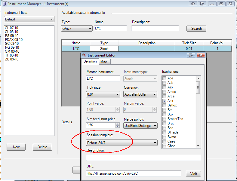 Now, if I go to instrument manager, I type in a code that may be on the list, say LYC as an example. It shows up and then I click the edit button, and the session template has changed. to default 24/7, but it should not be that, it should be ASX Equities.