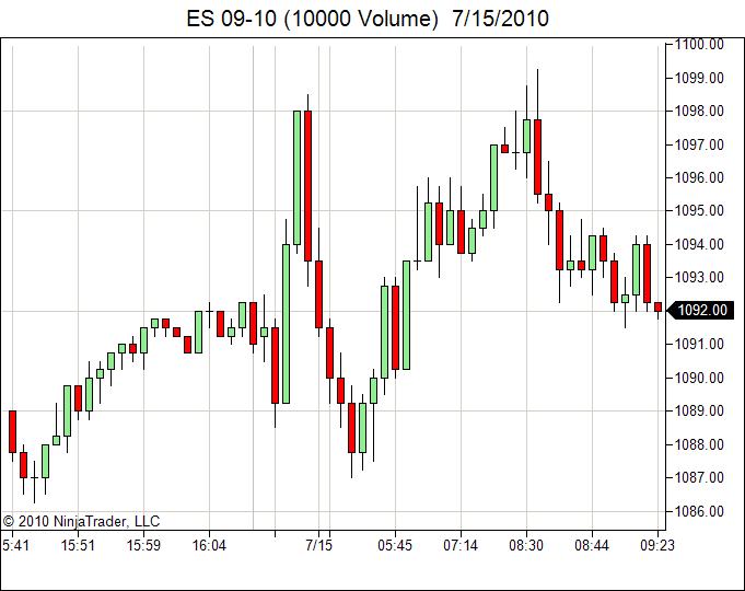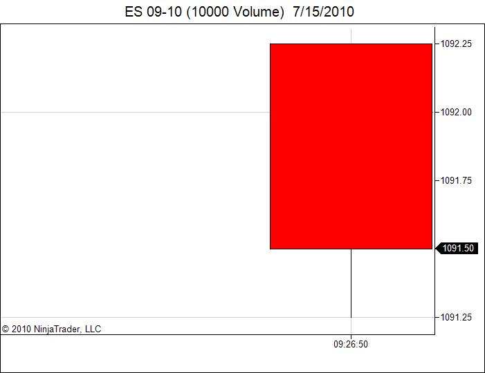 Meanwhile, I can't say that I agree that expanding the time axis is a viable method for getting the hh:mm:ss time format. Note the following screen shots. One is your basic, vanilla 10000 volume chart of ES. The second shows how much I had to expand it before the seconds appeared. Not very useful!