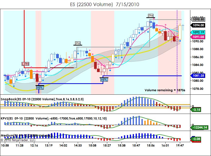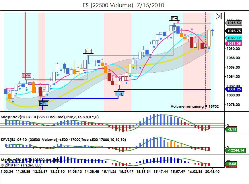 I have a workspace that includes a 3350 volume, a 7500 volume and a 22500 volume chart of ES. Today when the workspace loaded the format of the time scale on the 22500 was hh:mm:ss, while the format on the other two charts was the expected hh:mm. I liked that hh:mm:ss format so I started poking around with the 7500 chart for a bit to see if I could get it to appear there. Then I looked back at the 22500 chart, and the format had changed to hh:mm. (Wish I'd actually seen it change, but I didn't.)