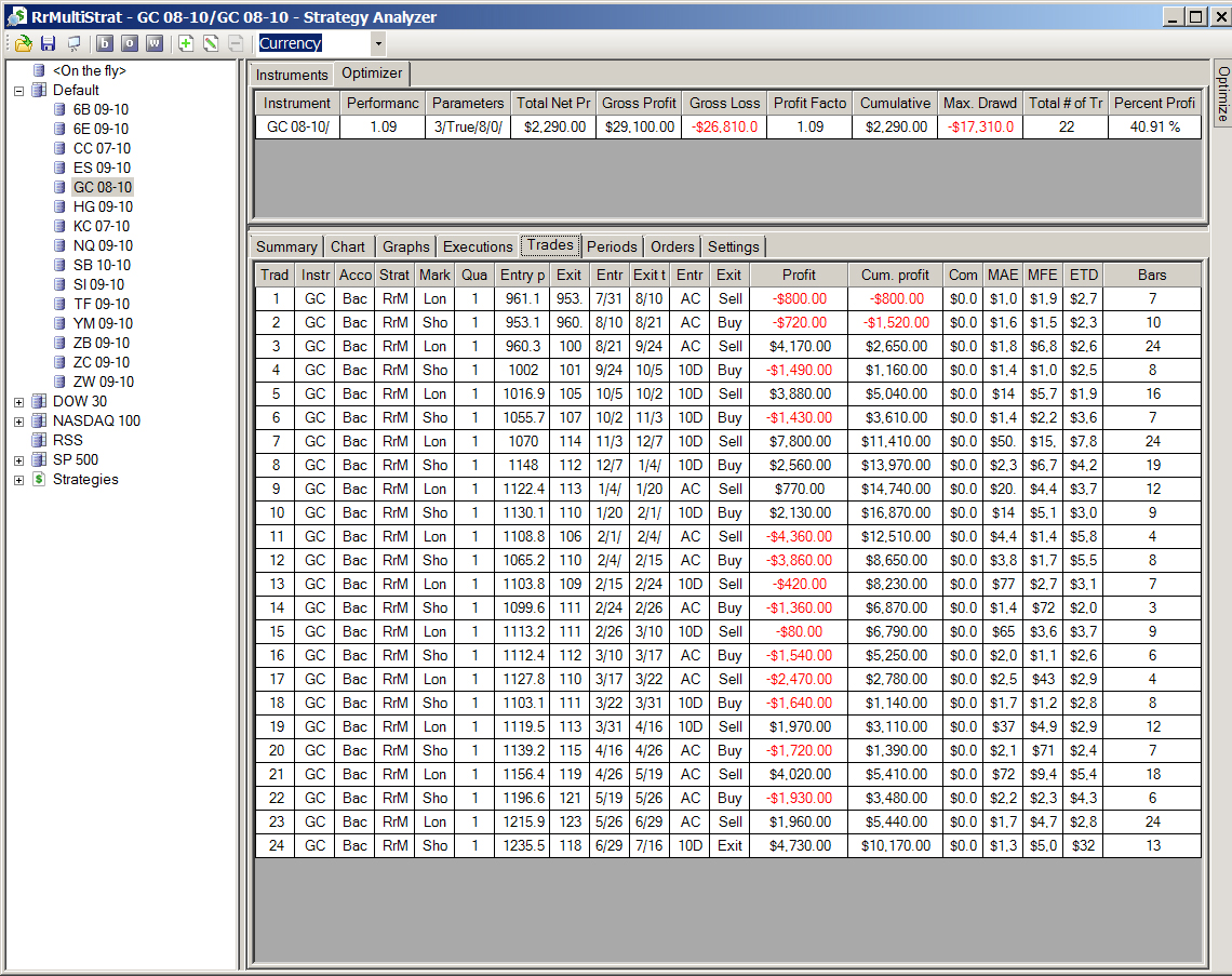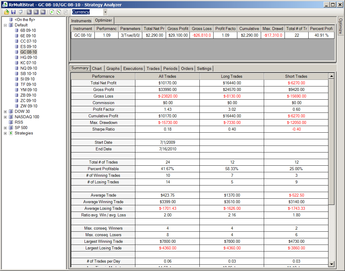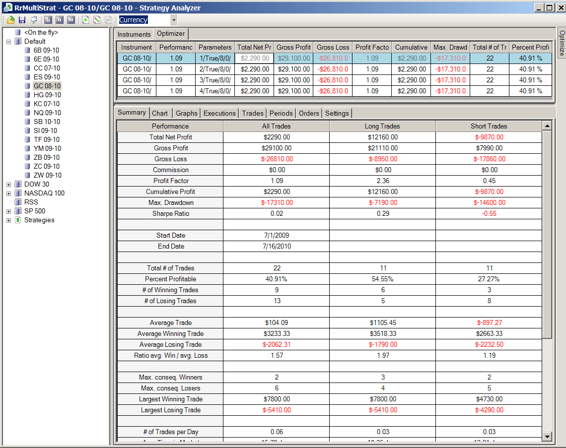 I'm running version 7.0.0.18. When I run the Optimizer function in the Strategy Analyzer, the summary line(s) show the wrong information. I ran a backtest first to see the results with the standard strategy parameters, and I then ran an optimization.