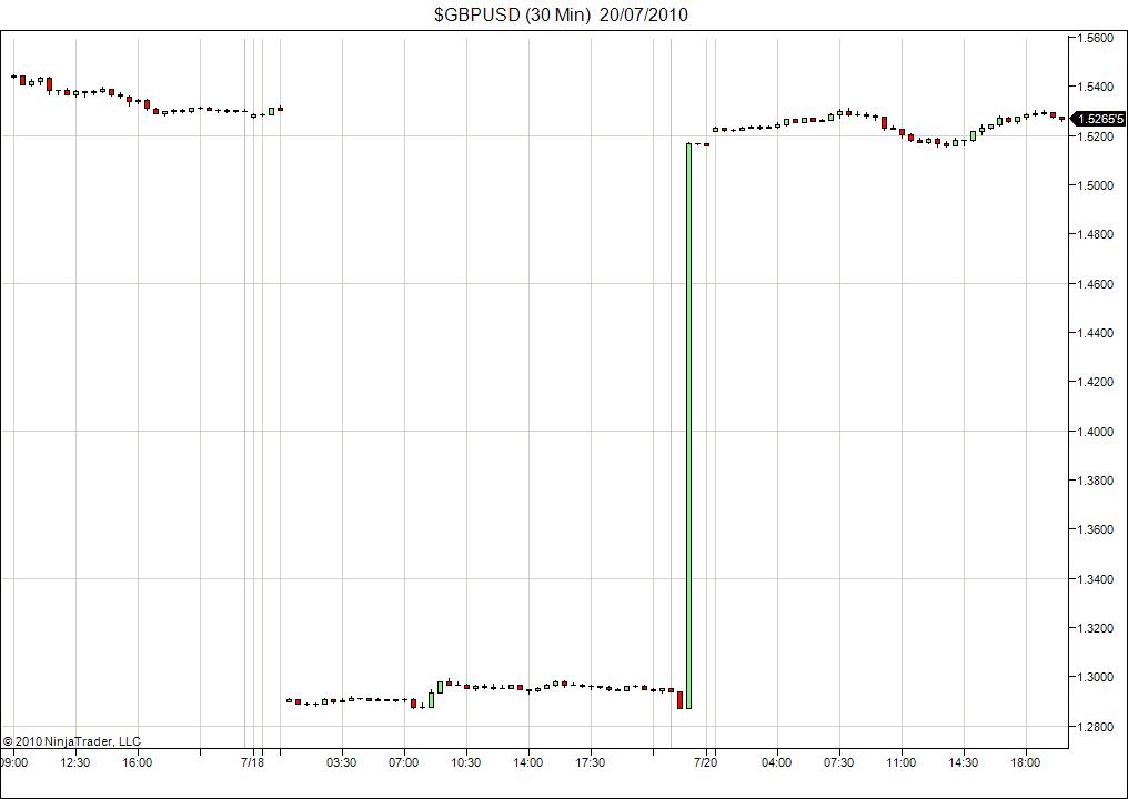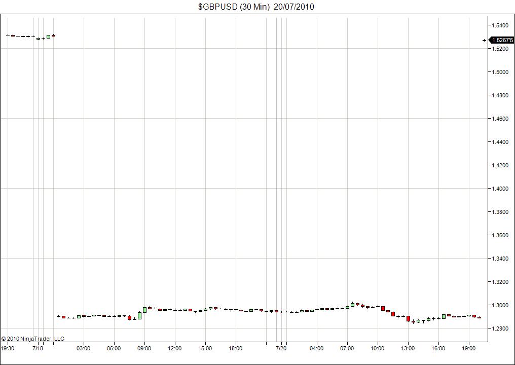 Yesterday I ran strategies via IB and of course had to close down at 22:15 GMT+0 because of the usual IB TWS daily forced shutdown. Stupidly I didn't have a chart open for $GBPUSD and it was only because my strategies were giving me crazy log statements that I checked.
